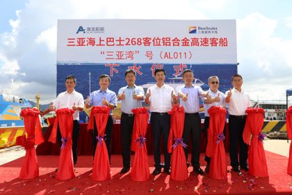 2021年5月27日09:38,中交海投所屬三亞藍色干線268客位高速客船“三亞灣”號在澳龍船廠順利下水。中交海投黨委副書記、總經(jīng)理周濟,九洲控股集團副總經(jīng)理、九洲藍色干線公司黨委書記、董事長梁凱斌,澳龍船廠董事長晏志清出席儀式并致辭。