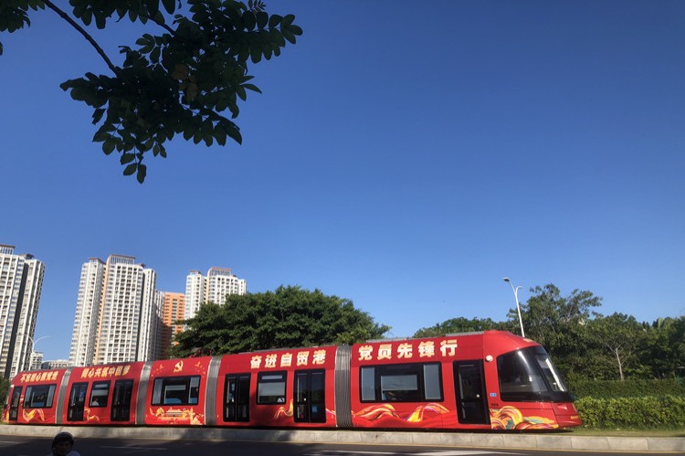 黨建主題列車在原有裝飾基礎(chǔ)上,在車身張貼“奮進自貿(mào)港·黨員先鋒行”黨建品牌名稱,在車頭張貼椰風(fēng)海韻特色的黨建品牌符號,讓中交海投黨建品牌標(biāo)識始終行程在路上,走進三亞市民群眾身邊。