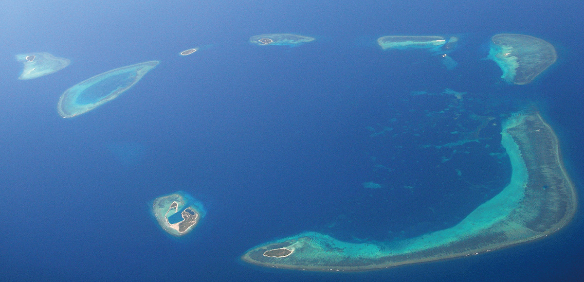 南海中分布著許許多多的珊瑚碓和珊瑚島,它們像一顆顆璀璨的明珠鑲嵌在湛藍(lán)的海面上。這些島碓總稱南海諸島,分為東沙群島、西沙群島、中沙群島、曾母暗沙、南沙群島和黃巖島。